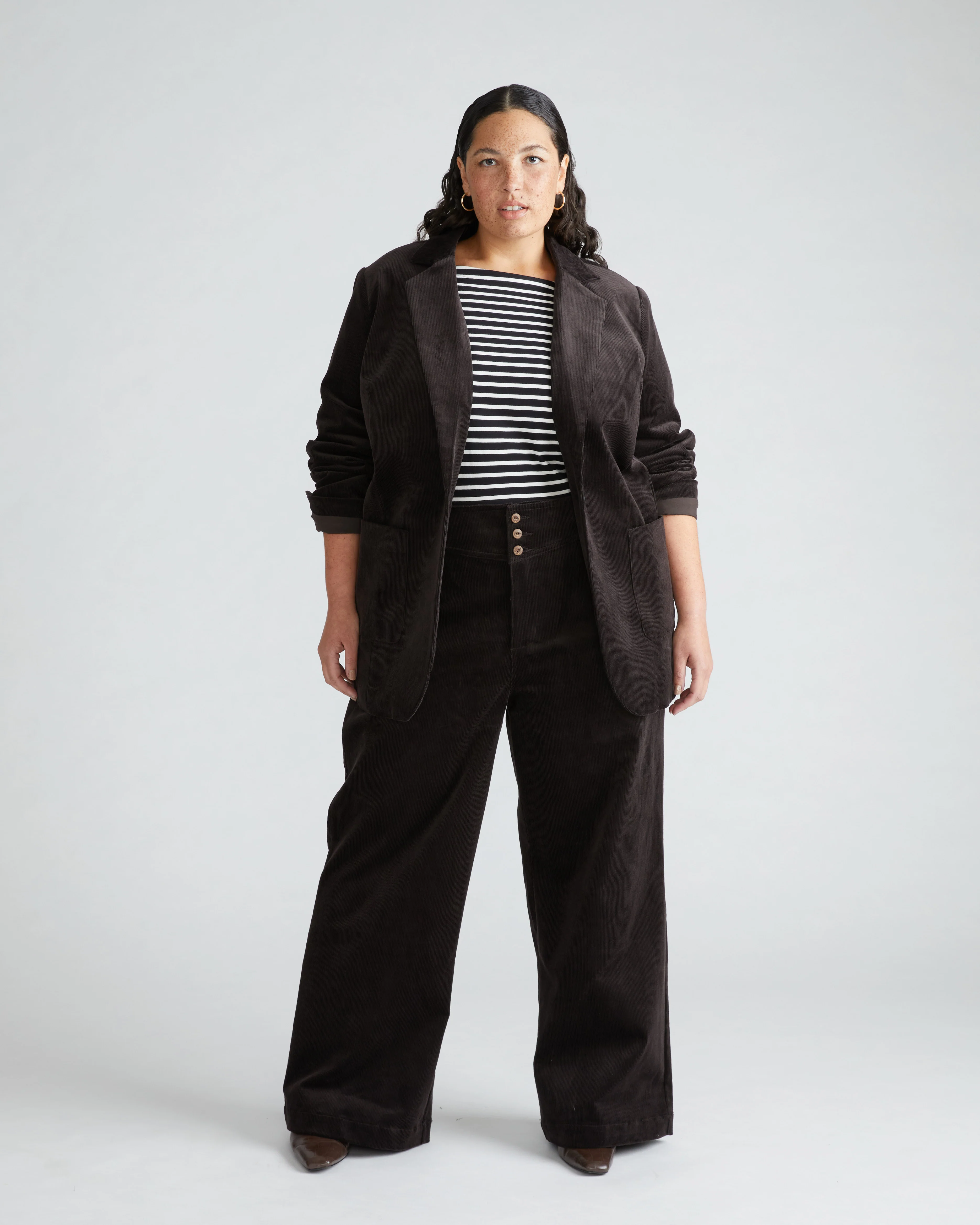 Good Morning, Charlie! These retro sailor-style corduroys feature an ultra high rise and a wide leg. Everyone’s closet needs that 1970s pant. The fit is elongating and on trend. We’ve put shaping darts at the back, three buttons at the waist, and top-entry pockets that sit flat.