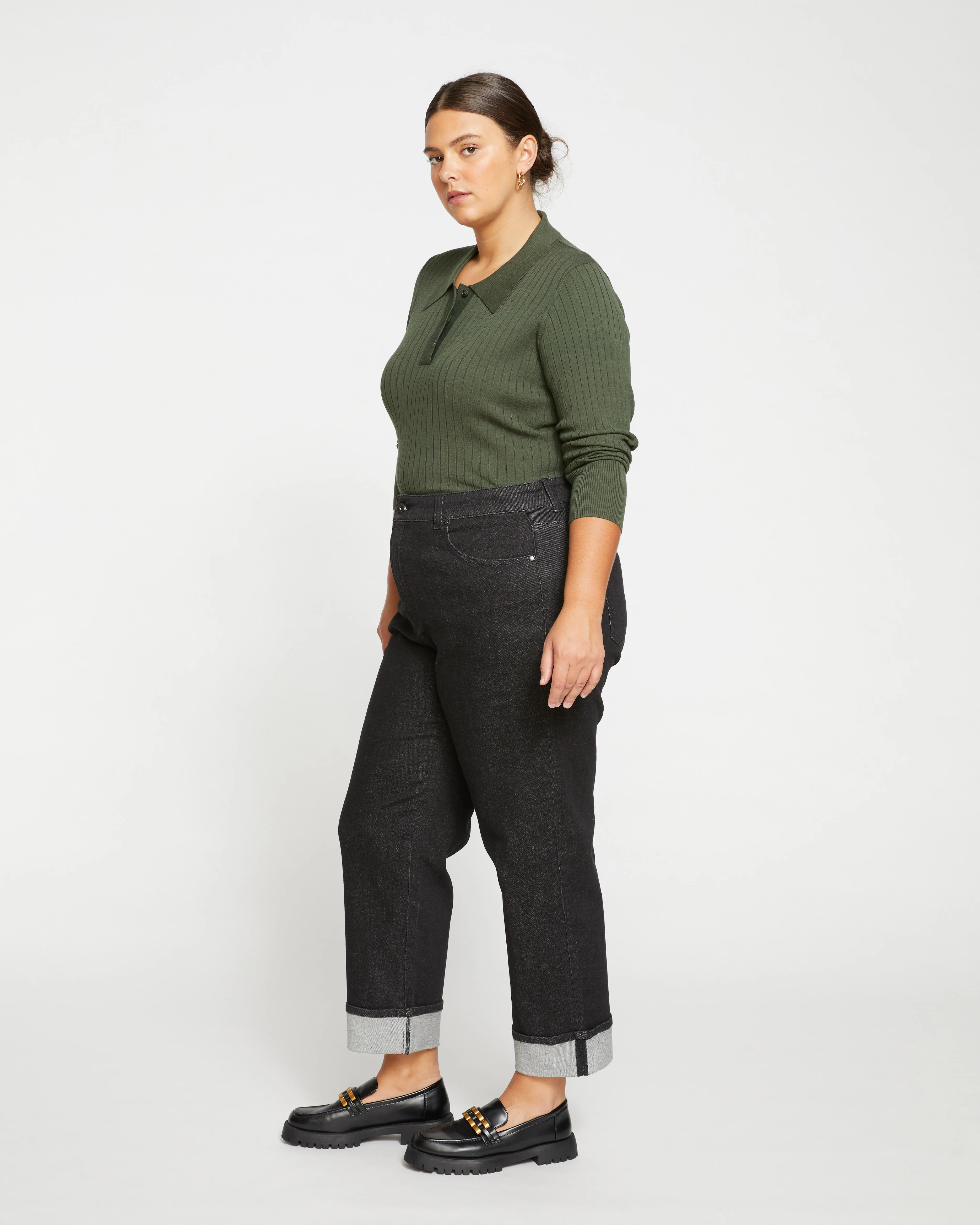 The Stevie High Rise Cuffed Straight Leg Jeans are the selvedge denim jeans of your dreams, plus just enough stretch (AKA you can get that raw denim look with that stretch denim feel). We constructed the Stevie Jeans for those who have less than a 10" waist-to-hip difference with a true straight leg fit that works for all occasions. Made from a more structured denim that only gets better over time and designed with a classically cool, wide cuff that is tacked at the seams, so it always stays in place. Of course, we have to mention the deep pockets. Timeless style combined with the right amount of hidden-stretch makes these jeans a pair you'll keep for life.